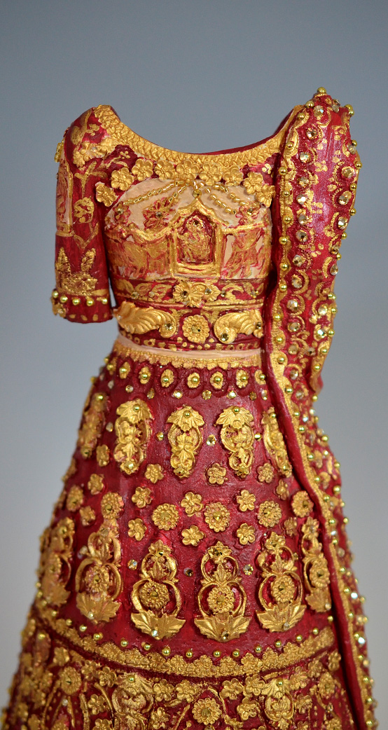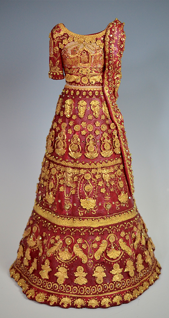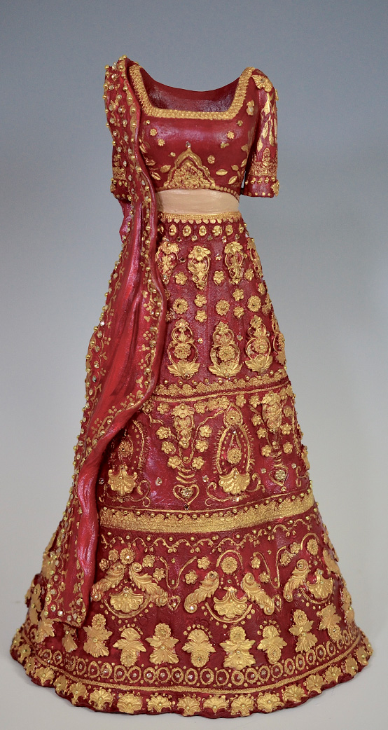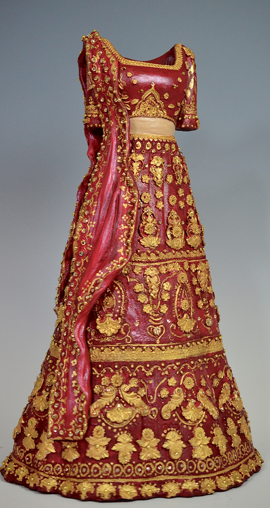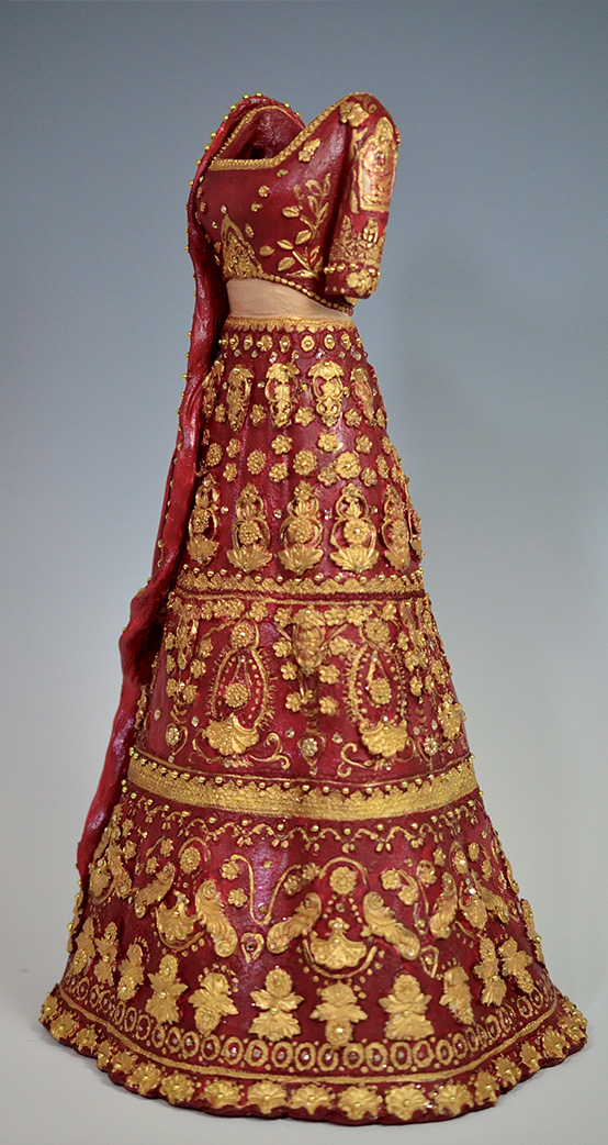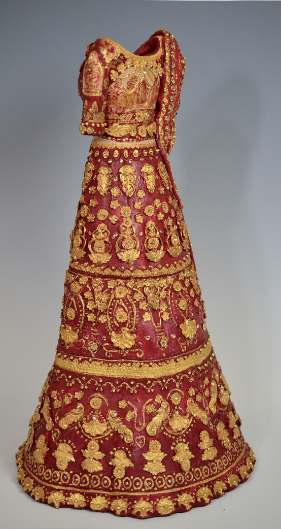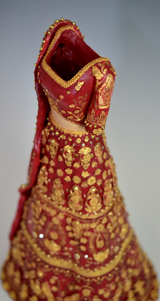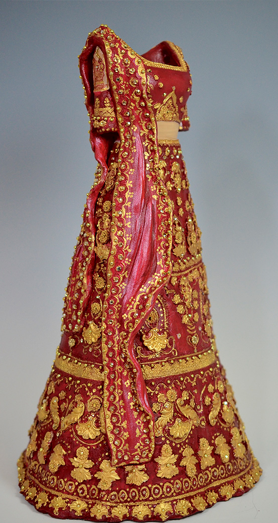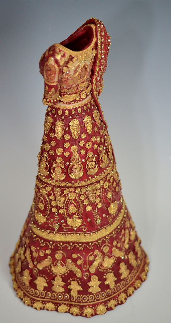 Handcrafted from stoneware clay this bridal lehenga sculpture has intricate beauty with hundreds of rhinestones, beads and gold pearls. She just sparkles with raised forms and beadwork details.