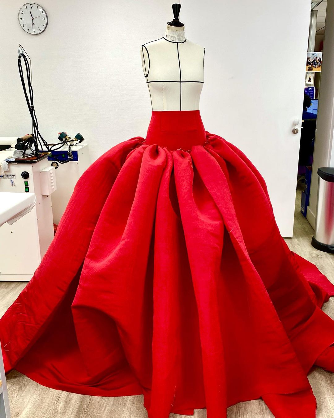 One of my favorite sculptures inspired by Schiaparelli is the replica of Lady Gaga’ s Inauguration gown. Designed by Schiaparelli Artistic Director, Daniel Roseberry, this couture gown features an impeccably tailored, midnight-blue jacket and a brilliant, vermillion red, billowing skirt. One of the most iconic details of this gown is the large golden brooch shaped like a dove.